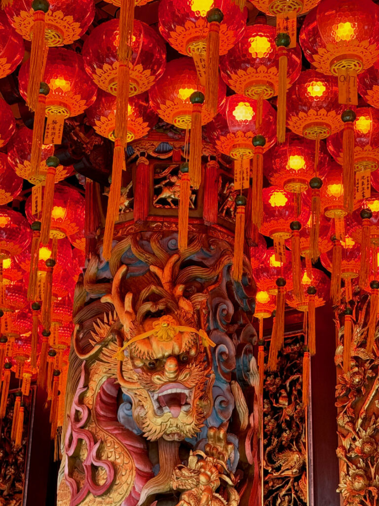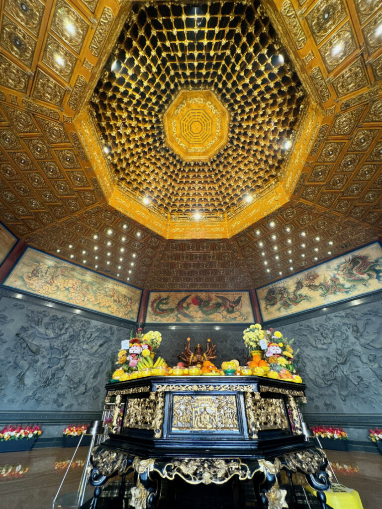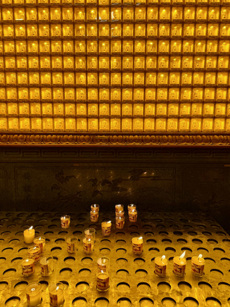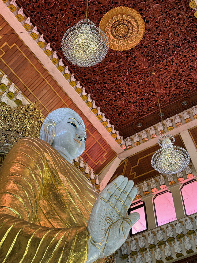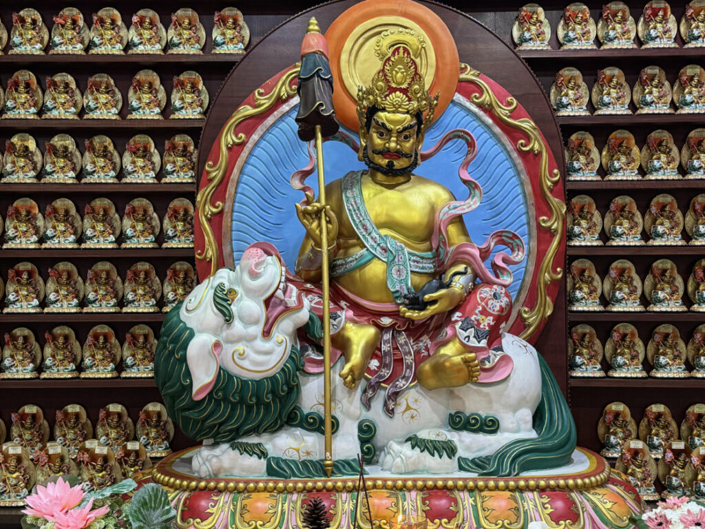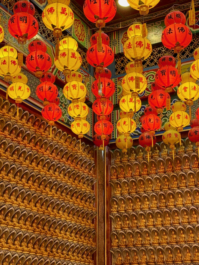La salle principale abrite une immense statue de Bouddha en marbre blanc doré à l’or fin.